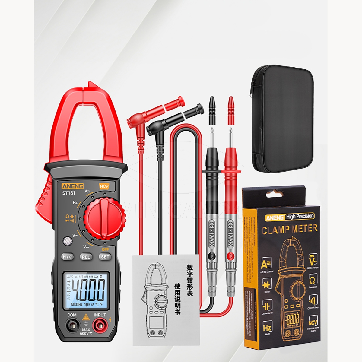 Цифровой мультиметр (токовые клещи) ANENG ST181 – прибор для точных измерений в различных областях электрики и электроники. Он оснащен ручным выбором пределов измерений, что позволяет пользователю настраивать прибор в зависимости от задач. Мультиметр поддерживает широкий диапазон измерений: от постоянного напряжения (DC) 400 мВ с разрешением 0,01 мВ до переменного напряжения (AC) 600 В, а также измеряет токи переменного тока (AC) в диапазоне от 40 А до 400 А.